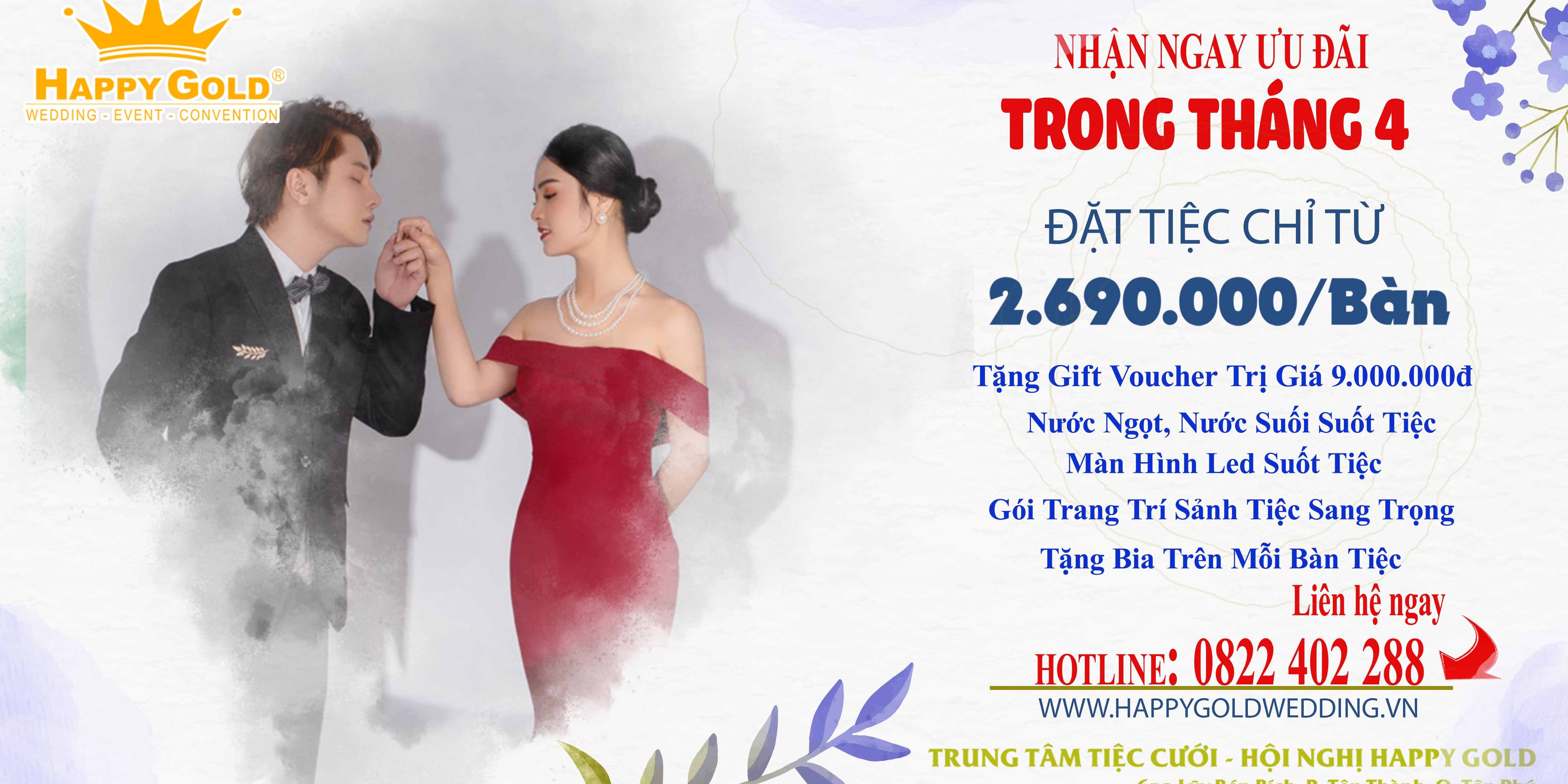 – Thật vui cùng các cặp đôi khi Trung Tâm Tiệc Cưới Hội Nghị Happy Gold dành tặng những ưu đãi đặc biệt dành cho cô dâu & Chú rể đặt tiệc.